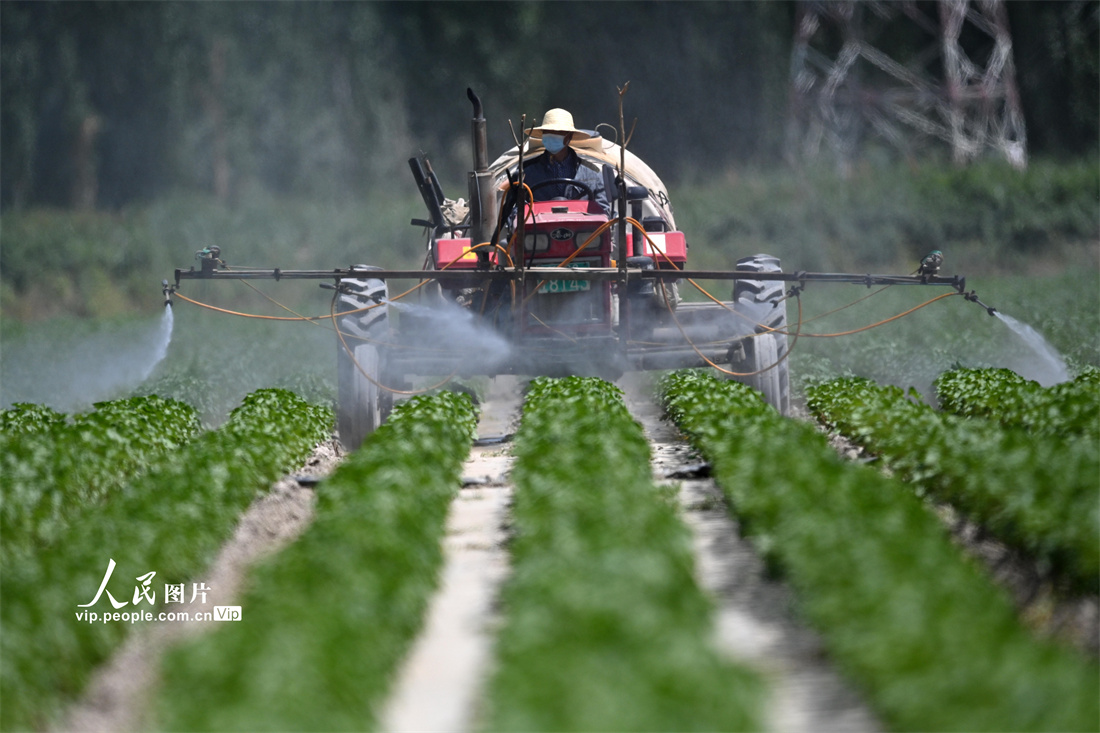 2022年6月5日,新疆库尔勒市普惠乡普惠村棉农对棉田进行防虫害作业。确·胡热摄