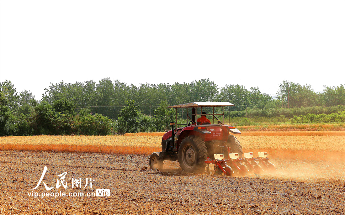 2022年6月5日,在山西省运城市夏县南大里乡南北晋村田野上,村民把麦茬地深耕后,复播玉米和黄苓药材,实现“一种两收”。张秀峰摄