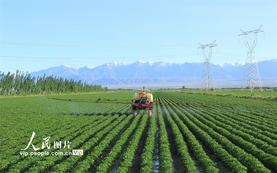 2022年6月5日,职工驾驶农机在新疆生产建设兵团第二师二十二团三连种植的辣椒农田里喷洒防治农作物病虫害的药物。谢江林摄