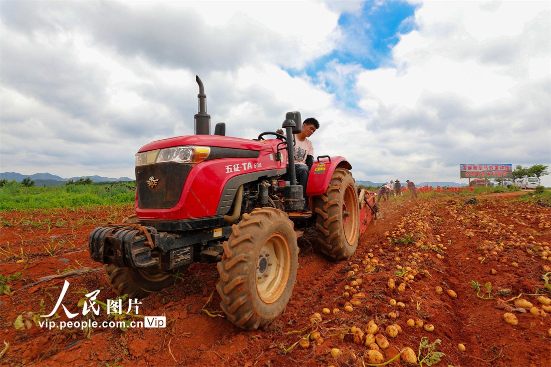 2022年6月4日,在云南省曲靖市陆良县小百户镇中坝村羊头山新型马铃薯示范种植基地里,农民正在驾驶拖拉机深翻马铃薯。王勇摄
