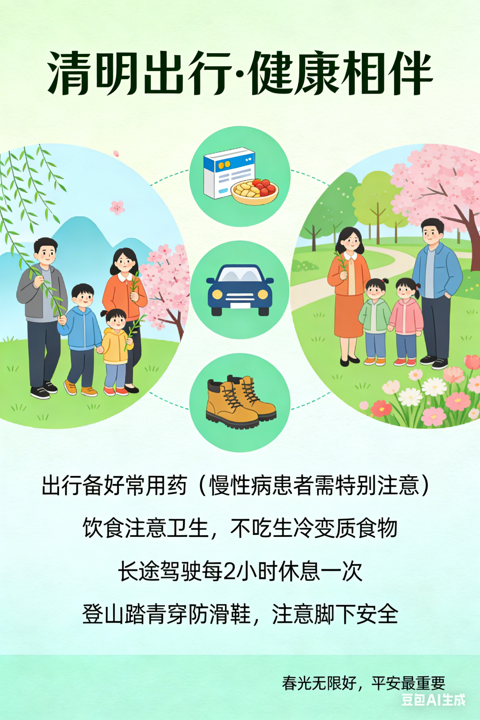 清明小长假开启,无论是回乡祭扫还是外出踏青,都别忘了带上健康。出行备好常用药,特别是慢性病患者;饮食注意卫生,不吃生冷变质食物;长途驾驶每隔2小时休息一次,避免疲劳;登山踏青时穿防滑鞋,注意脚下安全。春光无限好,平安最重要。