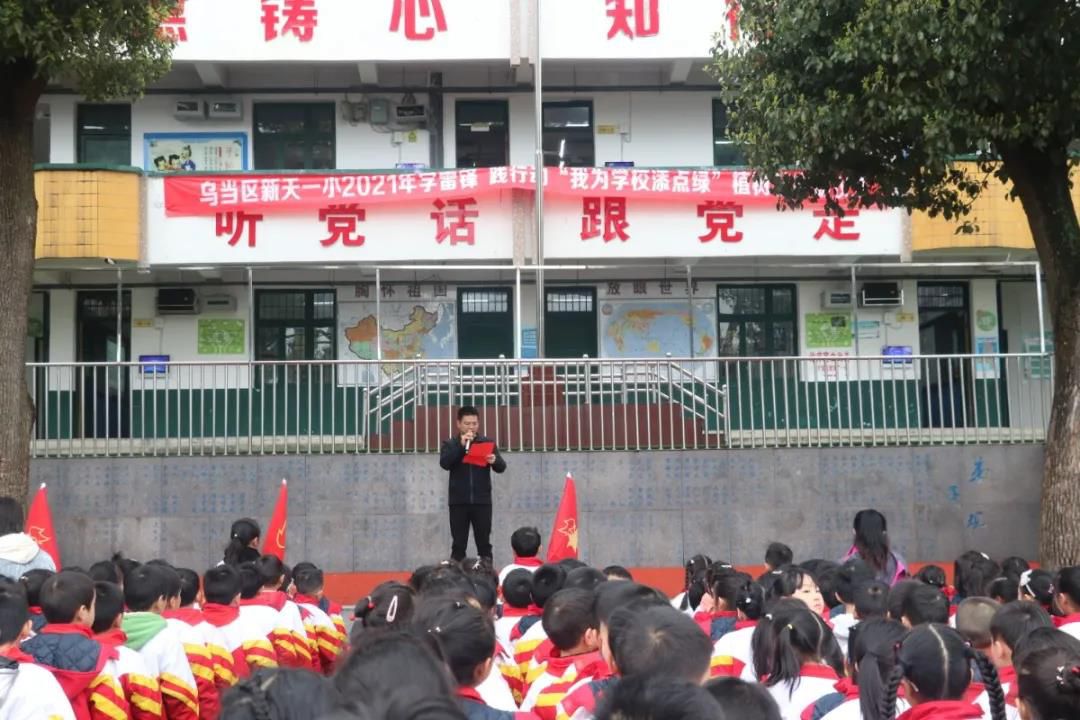 乌当区新天一小的少先队员们佩带鲜艳的红领巾在操场上开展了“学雷锋、践行动·我为学校添点绿”植树节启动仪式。仪式上,学校支部书记、张永富校长号召全校师生行动起来,为一小的春天绽放属于自己的色彩,号召全体同学从我做起、从小事做起,从身边、从现在做起,做绿化、美化环境的有心人。