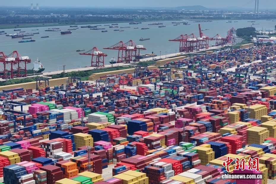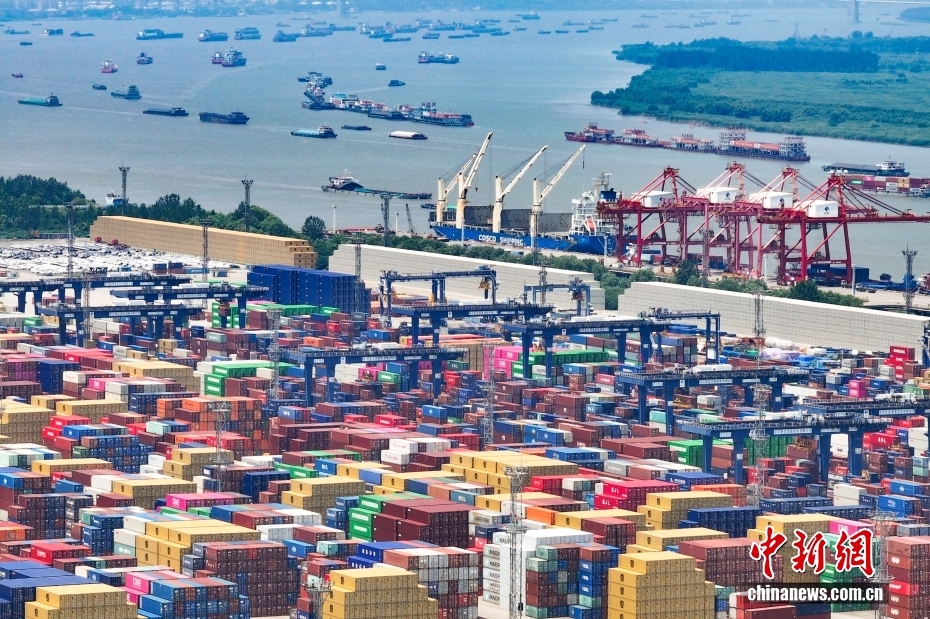 资料图为2025年7月14日,航拍长江沿线南京龙潭港进出口集装箱码头。(无人机照片)