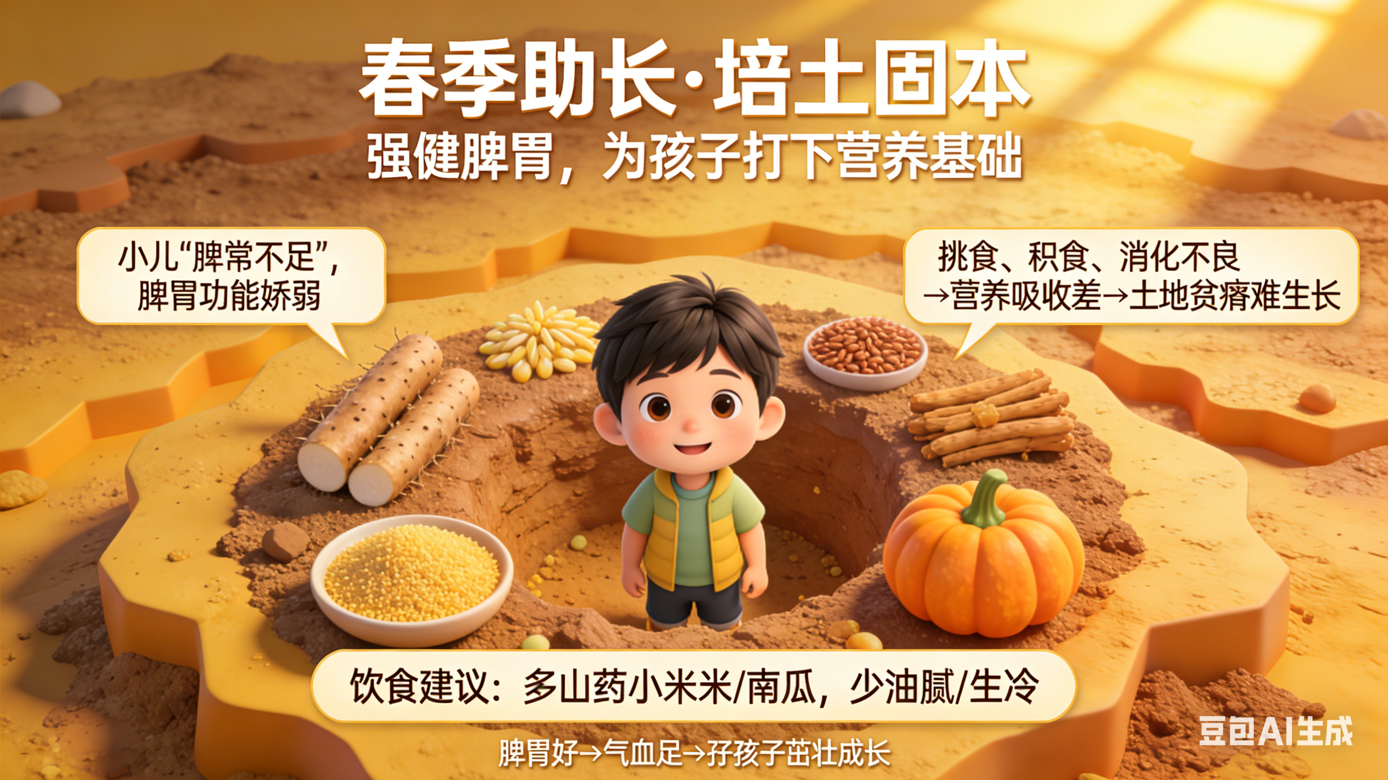 中医认为,春季助长的关键在于“培土固本”——强健脾胃,为孩子打下营养基础。小儿“脾常不足”,脾胃功能娇弱,如果挑食、积食、消化不良,营养吸收不进去,就像土地贫瘠,再好的阳光也难以生长。饮食上可适当增加山药、小米、南瓜等健脾食材,少油腻、少生冷。脾胃好了,气血生化有源,孩子才能茁壮成长。