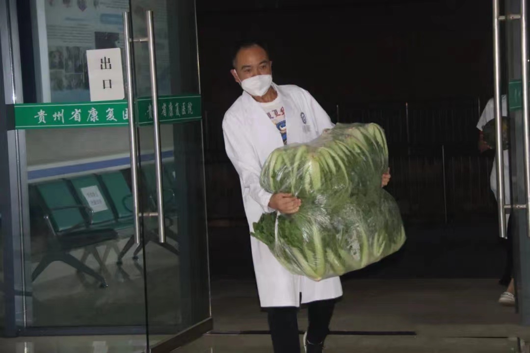 贵州省康复医院共隔离管理200余名病患及其家属,其中包括120名残疾儿童及家长、30名住院老年病人、20余名陪护人员。为保障院内物资供应,贵州省康复医院积极对接水田镇周边村寨农民收集到300斤蔬菜水果,同时汇集水田镇政府捐赠的200斤蔬菜,通过昼夜不休的忙碌,工作人员将这些新鲜蔬菜水果运送至病区分发给患者,尤其是各位儿童家长,切实尽全力保障残疾儿童这个特殊困难人群的营养物资供应。