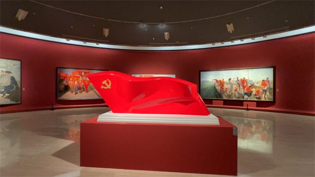 作为吴为山的代表作之一,《旗帜》以迎风招展、气势如虹的党旗形象,象征中国共产党意气风发的精神风貌。邵晓峰介绍,以党旗为引领,这些美术作品展示了劳动人民勇立时代潮头、争做时代先锋的奋发精神。
