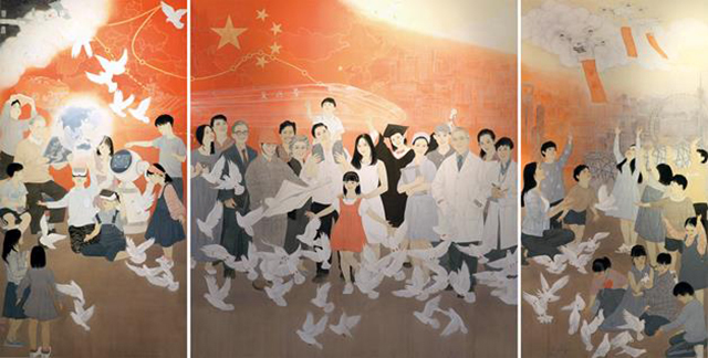 中国画《助梦》以工笔画的表现手法,形象描绘了四川省凉山州火普村村民迎接脱贫示范户的场景,呈现出凉山彝族群众的追梦成果。油画《唱响明天——打造千年雄安》用温暖的橘色描绘作者心中的家乡雄安,通过刻画雄安建设者,歌颂劳动人民脚踏实地,把理想家园变成美丽现实。中国画《放飞梦想》以百姓的视角看待今天的美好,以飞翔的白鸽寓意美好的未来。这件作品用三联画的形式,阐释“中国梦”的“国家富强、民族振兴、人民幸福”内涵。