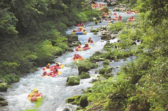 黔东南州镇远县高过河漂流景区有“休闲避暑胜地,度假漂流天堂”美誉,林幽潭美、瀑声蝉鸣。近年来,景区推出游览观光、民俗体验等新业态。图为7月7日,游客在此尽情体验漂流乐趣。