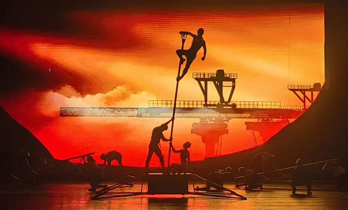 《脊梁》以贵州交通建设为题材,巧妙地把贵州传统文化、地域文化、民族文化融入剧情中。它采用了杂技特有的“惊奇险美”和充满张力的肢体语言,与舞蹈、戏剧、魔术等艺术形式相融合,进行了全新的艺术表达。全剧共分为七个篇章,分别是《梦出腊子崖》《冲破拦路虎》《邂逅断层山》《勇跨乱风谷》《与娘亲诉说》《遇险见真情》《庆功话离别》。在这些篇章里,演员们以“空中飞人”模拟修路架桥的艰难,以“蹬鼓技巧”隐喻攻坚克难的拼搏精神,以“双人荡杆”再现侗族山寨的浪漫月色。“集体脚手架”展现建设者们的众志成城,“钢丝技巧”刻画生命依托的团队精神。舞台上还运用了高科技全息投影技术,将贵州从“地无三里平”到“县县通高速”的巨变直观地呈现出来。这种技术的运用实现了“技术戏剧化”的转型,超越了传统杂技“炫技优先”的模式,使《脊梁》成为一部融合技、戏、情、思的综合性舞台剧。