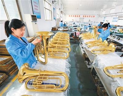 武强县周窝音乐小镇一家乐器企业的工人在整理乐器。苏小立摄