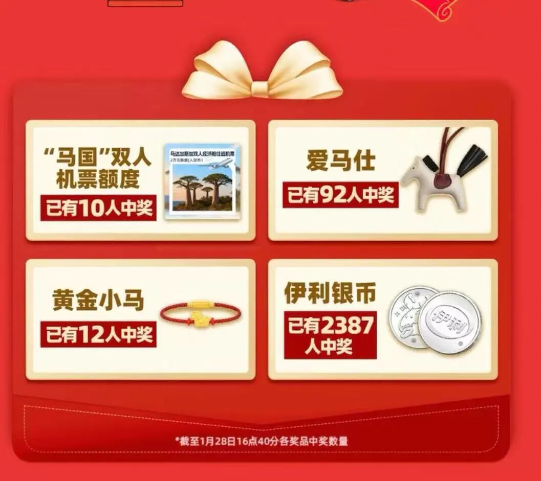 活动页面显示,截至1月28日16点40分,已有10人获得“马国”双人机票额度,92人中奖爱马仕,12人获得黄金小马。