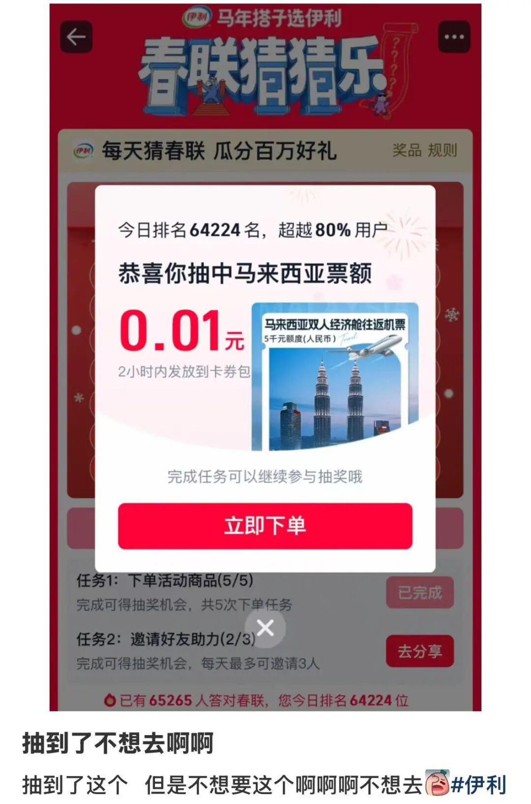 1月28日,不少网友发帖称,自己在伊利店铺抽奖活动中抽中了马来西亚双人机票、爱马仕围巾等奖品。随后,部分中奖者在社交平台试图转卖奖品。29日,伊利客服向极目新闻记者表示,活动真实有效,但奖品不得转让。