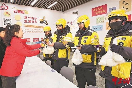 2023年12月27日,江苏省连云港市连云区墟沟街道桃园社区打造的“星火·骑手食堂”建成投用,现场为快递、外卖小哥赠送就餐优惠卡,推出“小哥专属优惠套餐”,提供错峰就餐服务,为新就业形态劳动者提供卫生健康、价格实惠的暖心餐食。
