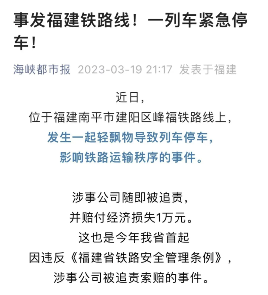 铁路部门呼吁不要在铁路沿线附近放风筝、氢气球、孔明灯等,也不要随意丢弃轻飘物垃圾。各地方单位和部门在仓库等场所需对防尘网、篷布、塑料薄膜等轻飘物妥善管理、压覆牢固。居民个人塑料大棚状态检查到位、固定牢靠,避免发生各类轻飘物造成的线路故障,确保铁路运输安全。
