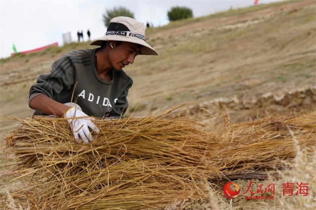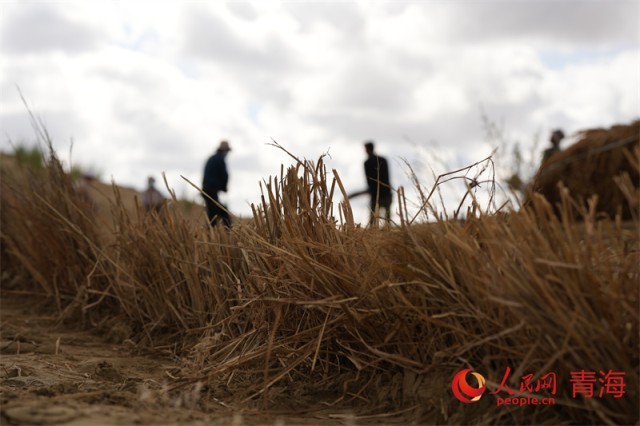 秋日的青海省海南藏族自治州共和县中部、塔拉滩沙漠边缘的沙珠玉乡,远远望去,一片片村庄掩映在高大的青杨、乌柳之间。近处的沙丘上柠条、梭梭迎风茁壮生长。沙珠玉当地群众在荒漠化区域制作草方格,开始新一轮治沙工作。