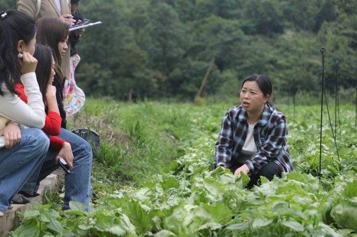 陈家秀向农户发放宣传资料,并讲解蔬菜防洪抗旱及病虫害防治知识