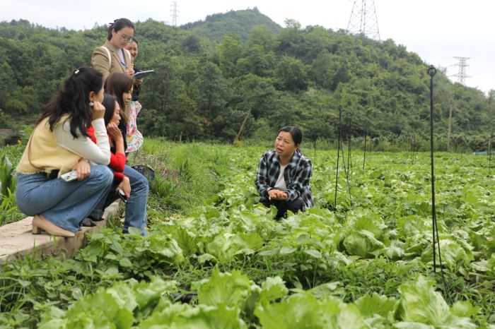 陈家秀(右一)蹲在田间向种植农户和部门人员介绍结球生菜的特点