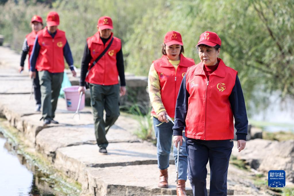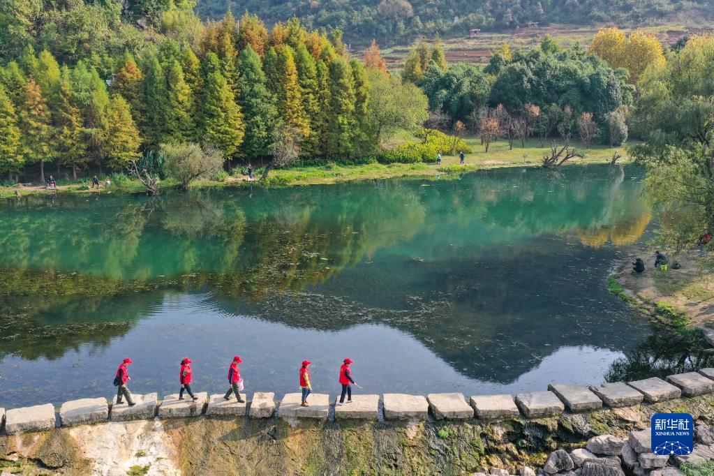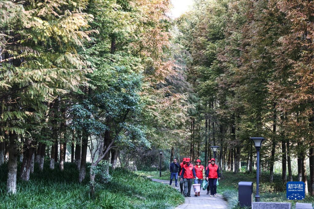 11月4日,在贵州贵阳,周余庆(前)与志愿者一起在花溪国家城市湿地公园内巡河。新华社记者 欧东衢 摄