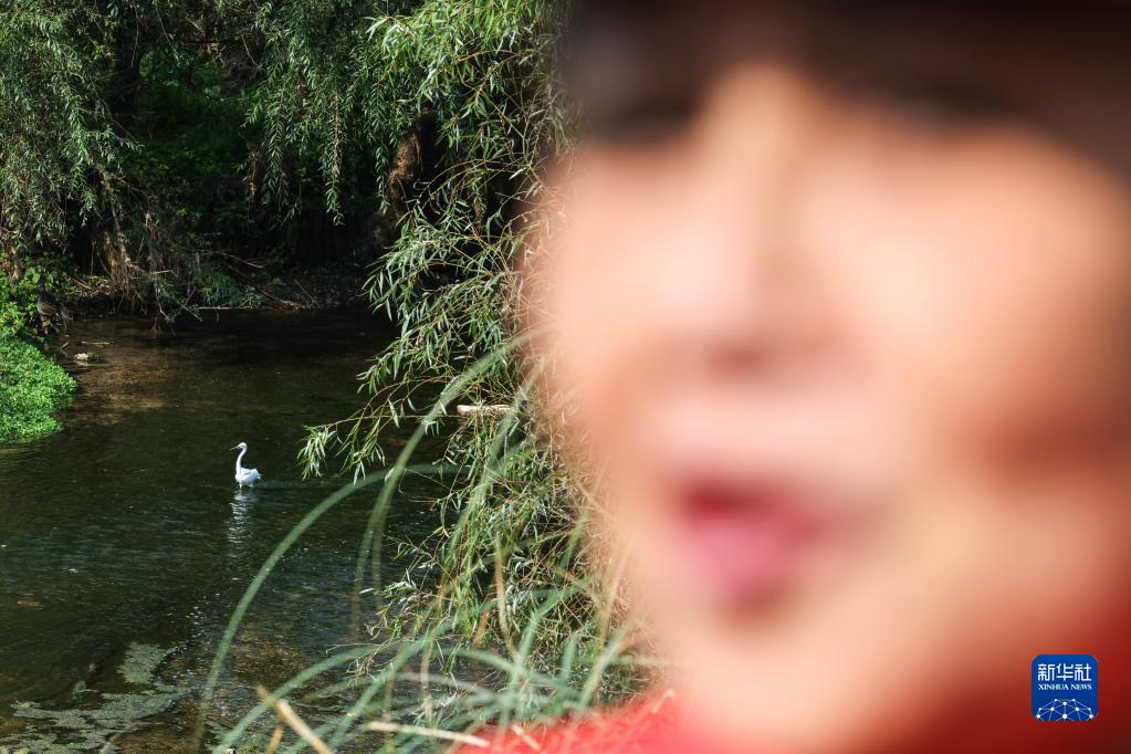 11月4日,在贵州贵阳,周余庆在花溪国家城市湿地公园内巡河,她身后一只白鹭在湿地里栖息。新华社记者 欧东衢 摄
