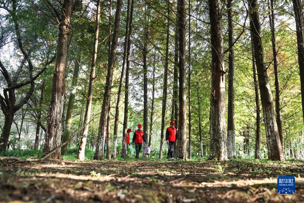 11月4日,在贵州贵阳,周余庆(右一)与志愿者一起在花溪国家城市湿地公园内巡查。新华社记者 欧东衢 摄