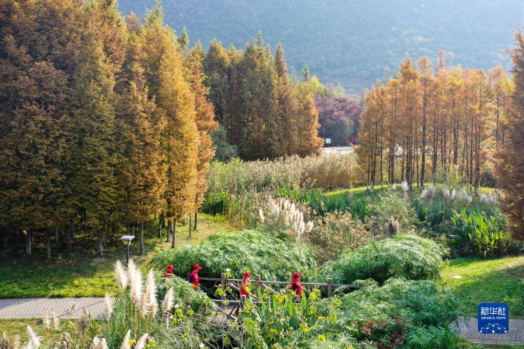 11月4日,在贵州贵阳,周余庆(右一)与志愿者一起在花溪国家城市湿地公园内巡查(无人机照片)。新华社记者 欧东衢 摄