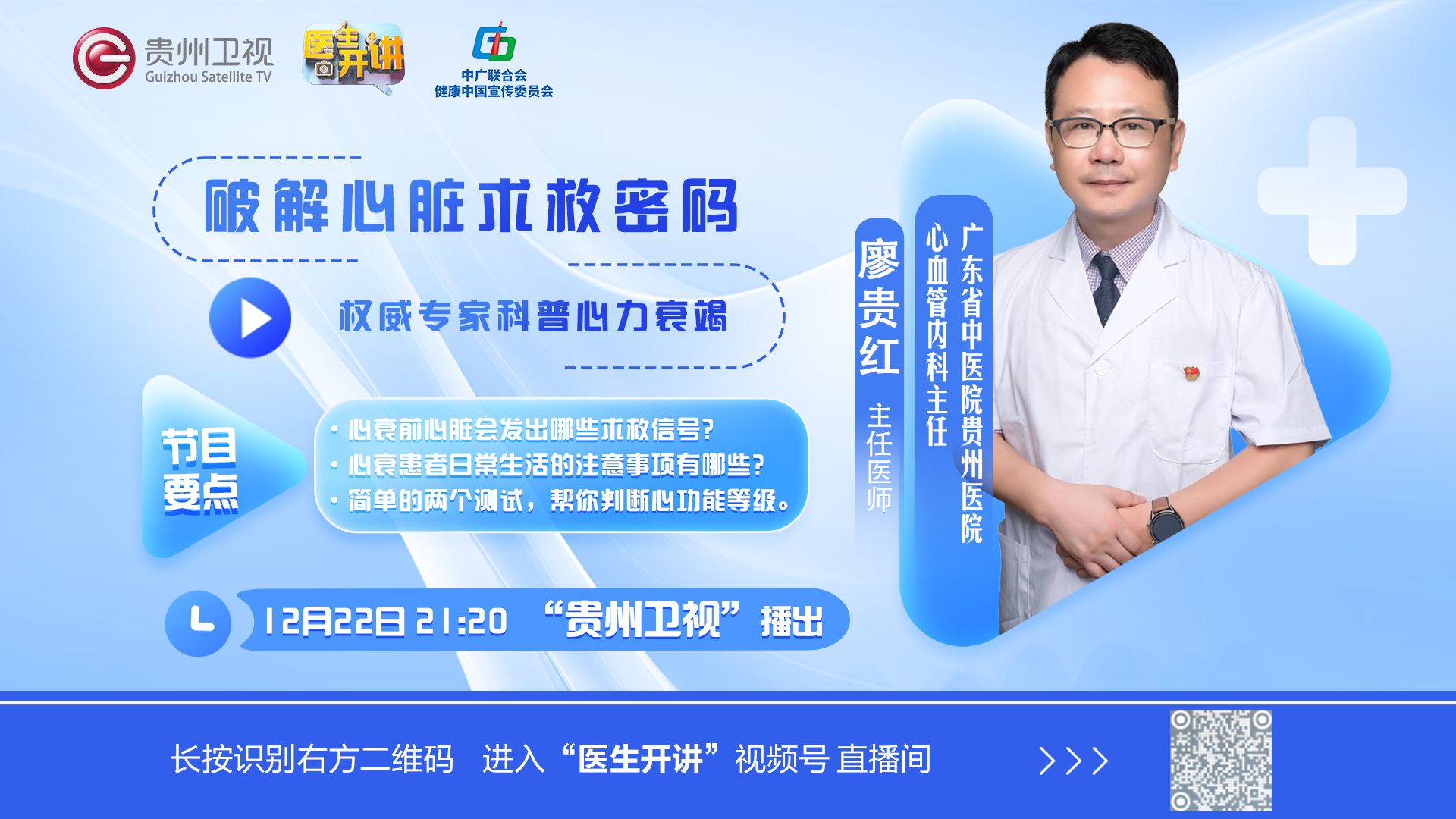 在本期节目中,我们邀请到了广东省中医院贵州医院心血管内科主任——廖贵红医生,为您权威解读心力衰竭的“求救密码”。锁定12月22日21:20《医生开讲》精彩不容错过,我们不见不散!