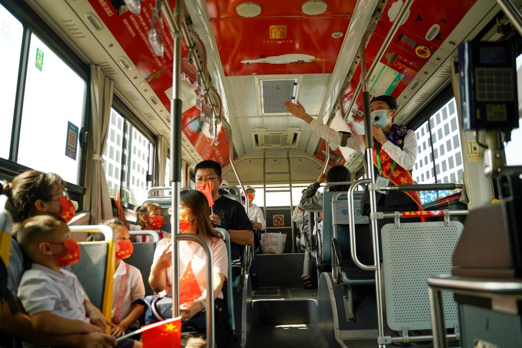“外滩车站的大红灯笼和五星红旗相得益彰,显示出浓厚的节日氛围。”上海市民张先生带着孩子乘坐71路中运量公交车,游览了中共一大纪念馆、上海博物馆和外滩。国庆节假期,上海多条公交线路推出红色专车、复古专车,乘公交车“阅读”城市历史成为市民足不出“沪”的新玩法。
