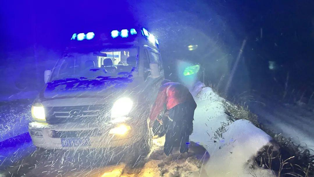 (黔东南州院前急救人员为车辆安装防滑链)