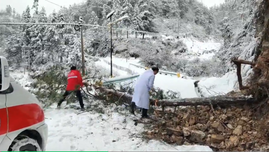 可就在急救车行经半路时,一颗松树被积雪压倒,横倒在马路中央,导致车辆无法过往。时间就是生命,随后医生和救护车驾驶员到附近农户家中借来斧头等工具,大家合力将大树砍断并顺利移除,救护车得以顺利通行。