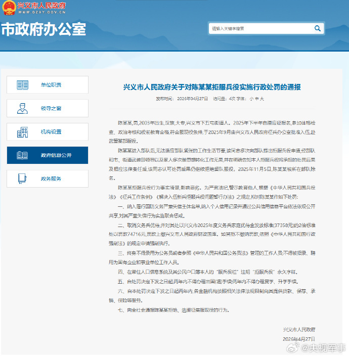 4月27日,贵州黔西南州兴义市人民政府发布关于对陈某某拒服兵役实施行政处罚的通报:陈某某,男,2003年出生,兴义市下五屯街道人。2025年下半年自愿应征报名,于2025年9月由兴义市人民政府征兵办公室批准入伍,赴武警某部服役。
