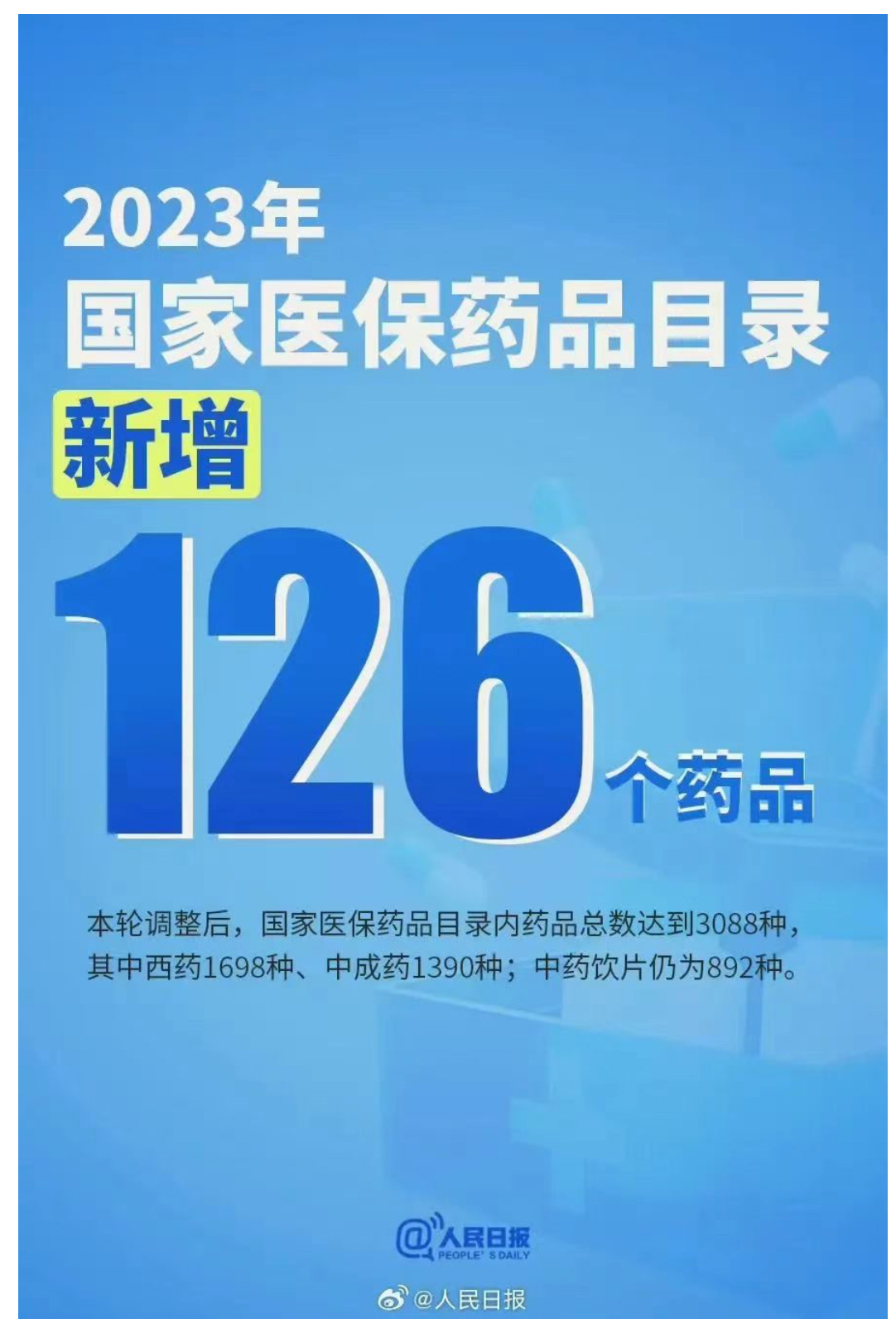 12月13日,国家医保局公布,2023年国家基本医疗保险、工伤保险和生育保险药品目录调整工作现已顺利结束。本次调整,共有126个药品新增进入国家医保药品目录,1个药品被调出目录。143个目录外药品参加谈判或竞价,其中121个药品谈判或竞价成功,谈判成功率为84.6%,平均降价61.7%,成功率和价格降幅均与2022年基本相当。