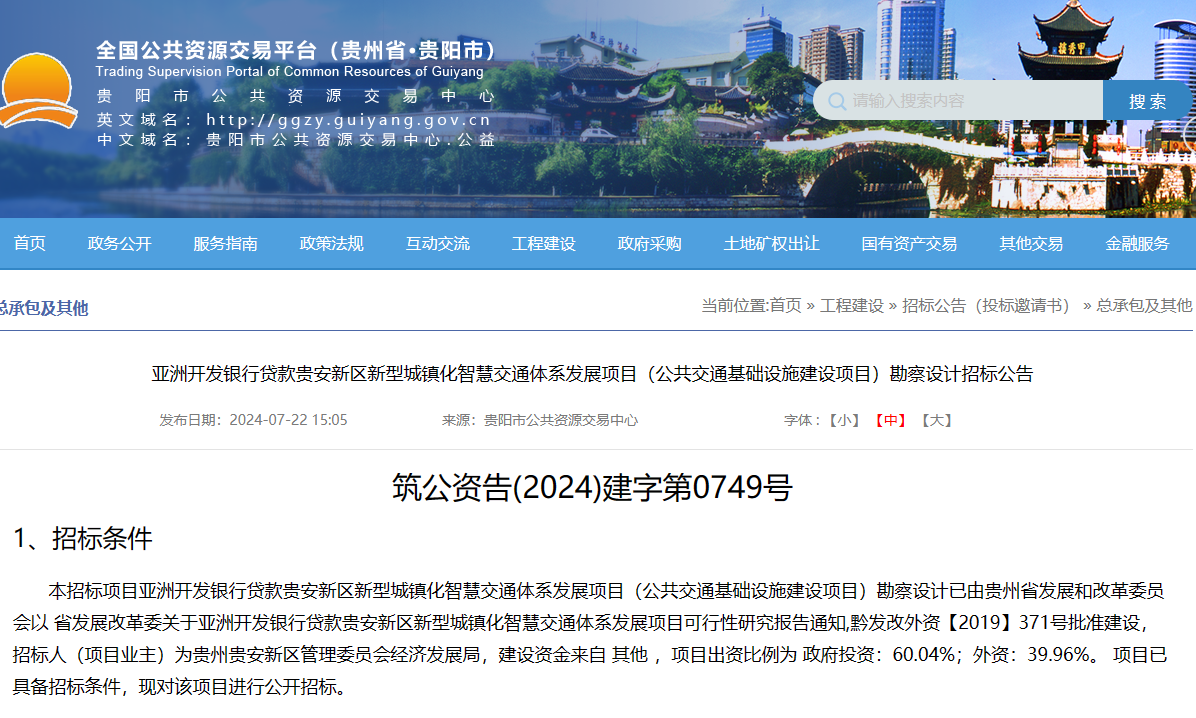 7月22日,贵阳市公共资源交易中心官网发布亚洲开发银行贷款贵安新区新型城镇化智慧交通体系发展项目(公共交通基础设施建设项目)勘察设计招标公告。