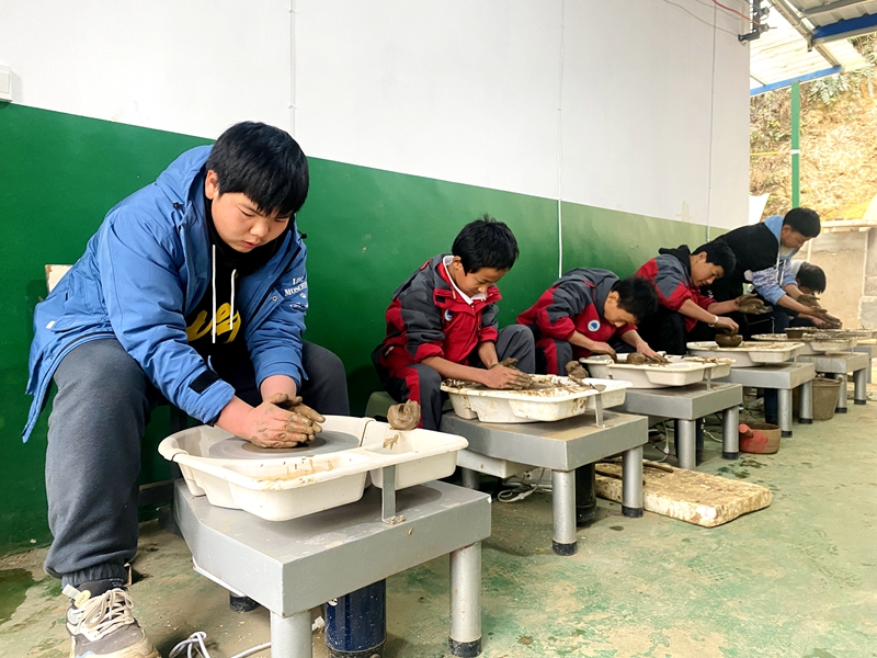 在盘州大山深处的旧营中学,学校将民族特色工艺黑陶制作纳入二课,丰富学生课余生活的同时传承了民族民间技艺。