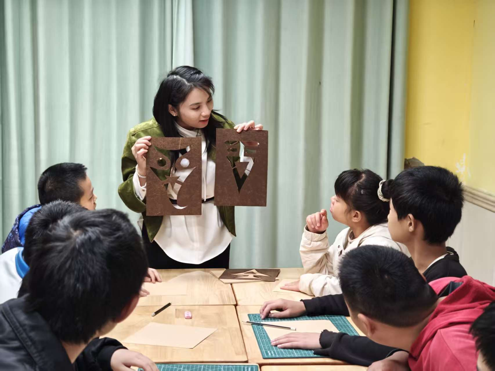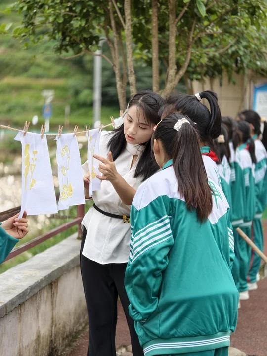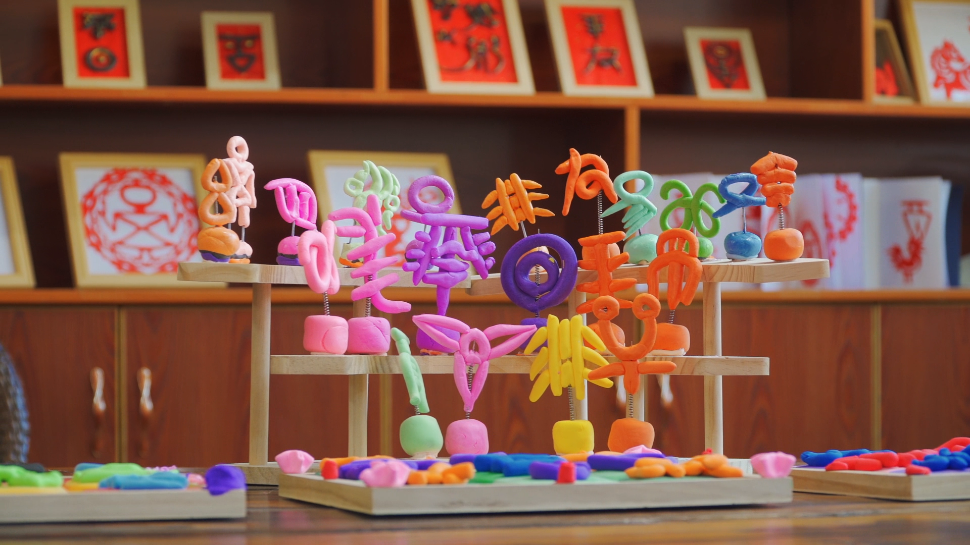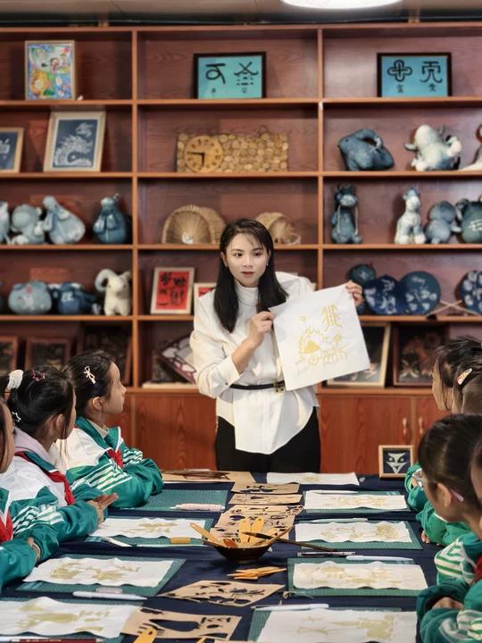 这份对非遗水书的热忱,早在2022年便已生根发芽。彼时,身为美术教师的彭洪丽,听闻归兰山脚下的都匀市归兰水族乡阳和中心完全小学藏着丰富的水族文化宝藏,便主动驱车翻山越岭前往探索。一踏入这片土地,水族老乡家中的水书手抄本、孩童服饰上的水族纹样,瞬间让她挪不开眼:“这些文字太特别了,是活着的象形文字‘活化石’,绝不能只躺在博物馆里。”在阳和中心完全小学的日子里,彭洪丽成了不折不扣的“水书迷”。她深入挖掘水书文字的图案性、装饰性等特征,创新打造“非遗+”教学模式,将水书与绘画、剪纸、蜡染、豆浆染等艺术形式深度融合,开发出趣写水书、美绘水书、巧剪水书等10个主题教学单元,形成60节完整的“万物皆可水书”艺术实践课程。孩子们用冰棍棍拼搭水书夜灯,暖光透过木缝映出“平安”“万福”等温润字样;用轻黏土捏制立体水书字,让平面符号变得可触可感;用传统蜡染技艺制作水书十二生肖布偶,古老文字与非遗技艺碰撞出古朴又时尚的火花。从扭扭棒组拼到戳戳绣创作,从五谷杂粮拼贴到掐丝珐琅点缀,20余种水书文创作品相继诞生,让曾藏于深山中的水书文字,走出博物馆成为孩子们引以为傲的“文化印记”。