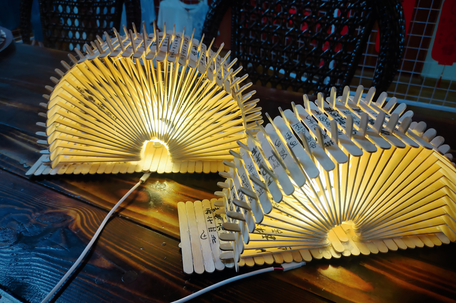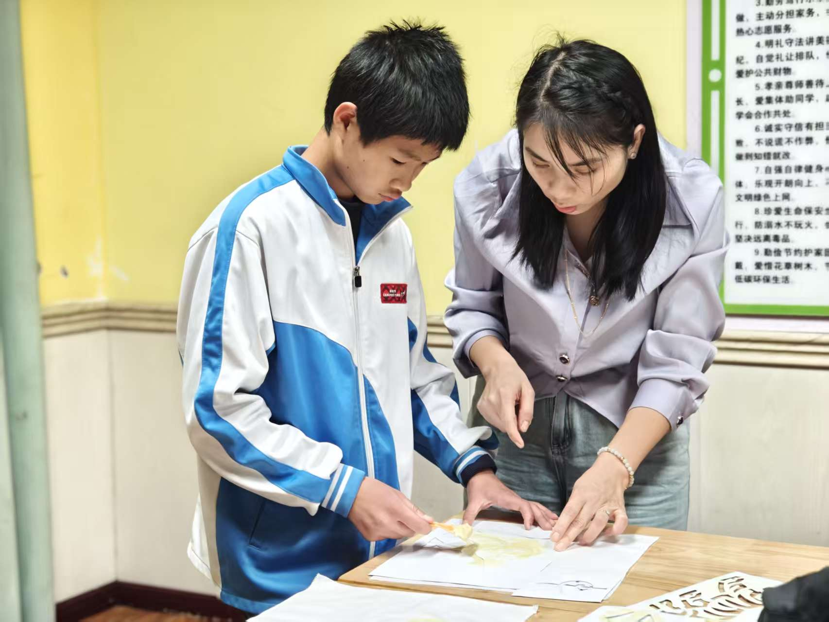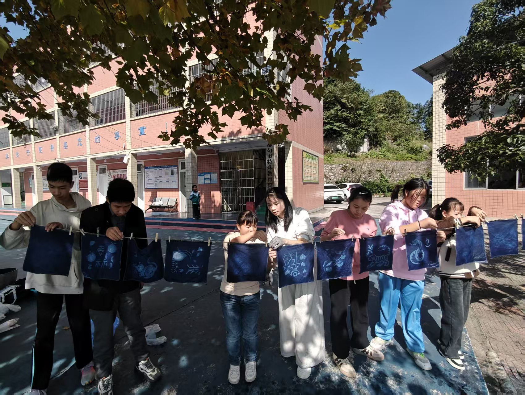 这份对非遗水书的热忱,早在2022年便已生根发芽。彼时,身为美术教师的彭洪丽,听闻归兰山脚下的都匀市归兰水族乡阳和中心完全小学藏着丰富的水族文化宝藏,便主动驱车翻山越岭前往探索。一踏入这片土地,水族老乡家中的水书手抄本、孩童服饰上的水族纹样,瞬间让她挪不开眼:“这些文字太特别了,是活着的象形文字‘活化石’,绝不能只躺在博物馆里。”在阳和中心完全小学的日子里,彭洪丽成了不折不扣的“水书迷”。她深入挖掘水书文字的图案性、装饰性等特征,创新打造“非遗+”教学模式,将水书与绘画、剪纸、蜡染、豆浆染等艺术形式深度融合,开发出趣写水书、美绘水书、巧剪水书等10个主题教学单元,形成60节完整的“万物皆可水书”艺术实践课程。孩子们用冰棍棍拼搭水书夜灯,暖光透过木缝映出“平安”“万福”等温润字样;用轻黏土捏制立体水书字,让平面符号变得可触可感;用传统蜡染技艺制作水书十二生肖布偶,古老文字与非遗技艺碰撞出古朴又时尚的火花。从扭扭棒组拼到戳戳绣创作,从五谷杂粮拼贴到掐丝珐琅点缀,20余种水书文创作品相继诞生,让曾藏于深山中的水书文字,走出博物馆成为孩子们引以为傲的“文化印记”。