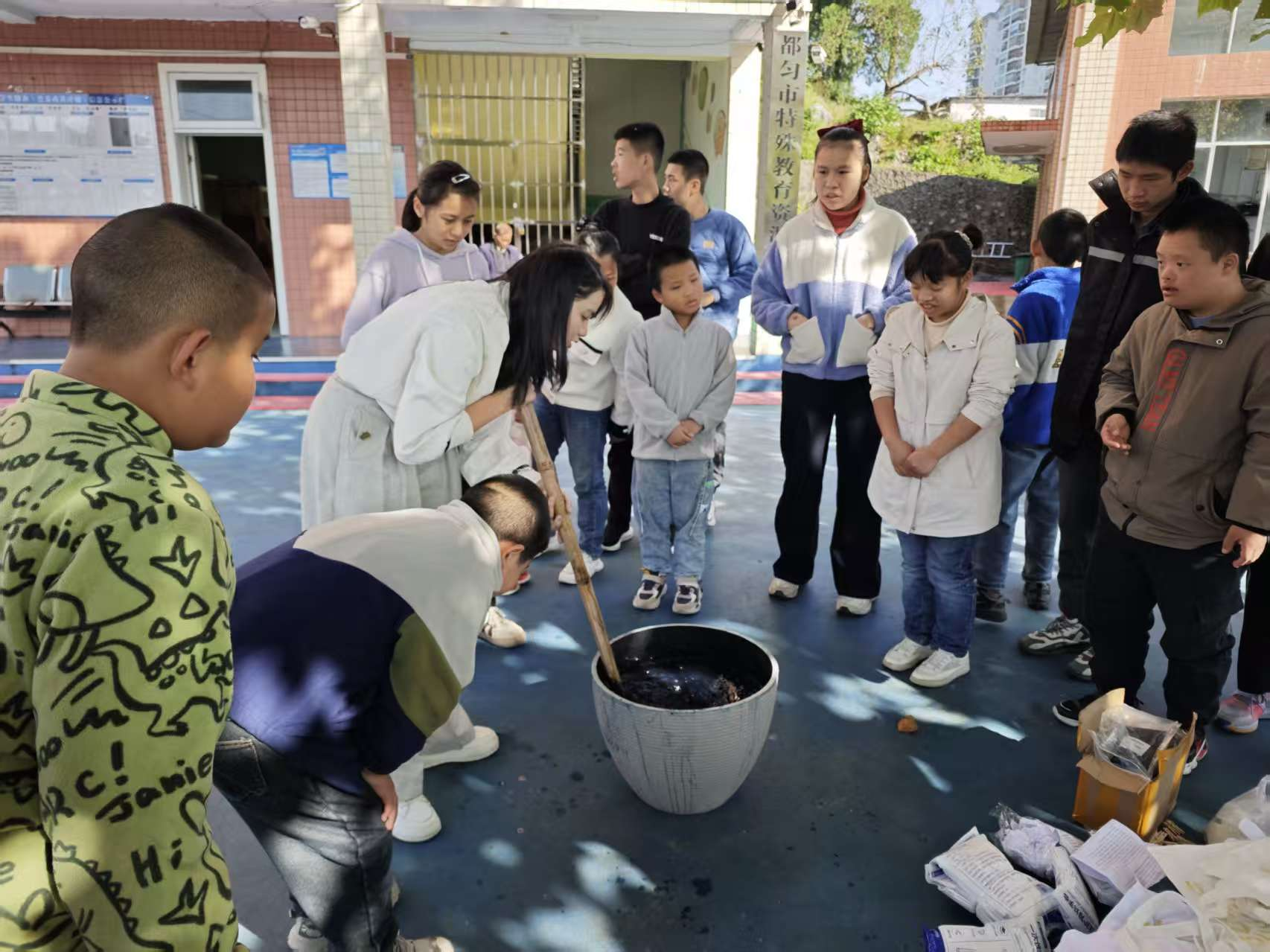 “每个孩子都该拥有触摸文化美的机会,水书那些像简笔画一样的符号,对特殊孩子来说特别友好,刚好能帮他们敲开家乡文化的大门。”彭洪丽笑着说。考虑到智力障碍学生的认知特点,她特意挑选“山”“水”“吉”这类简单易懂的水书文字,搭配常见的吉祥图案,和孩子们一起设计水书创意模板。课堂上,老师手把手耐心引导:先带着孩子们认识符号含义,再一步步教制版、上糊、调染料,接着体验染、拓印的乐趣,最后等着作品自然晾晒。古老的水书文字,在孩子们的指尖与现代文创撞出奇妙火花。当水书摆件、十二生肖布偶这些亲手做的作品新鲜出炉时,孩子们脸上绽放出纯粹又灿烂的笑容,成了校园里最治愈人心的风景。