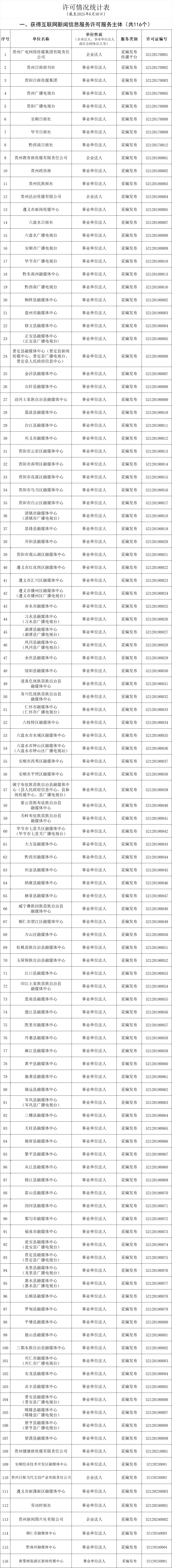 自2017年6月《规定》实施以来,贵州省互联网信息办公室依法组织开展了许可审批相关工作。截至2025年6月30日,经贵州省互联网信息办公室审批的互联网新闻信息服务单位总计116家,具体服务形式包括:互联网站50个,应用程序75个,公众账号480个,共计605个服务项。