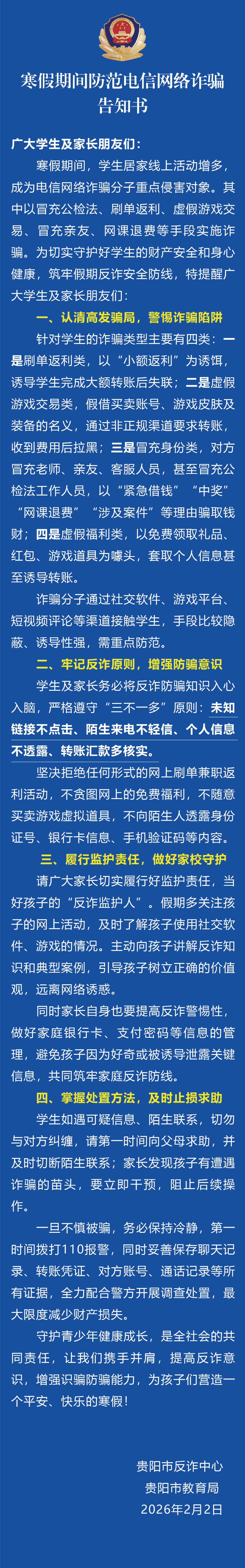 寒假期间防范电信网络诈骗告知书,请学生与家长务必知晓!