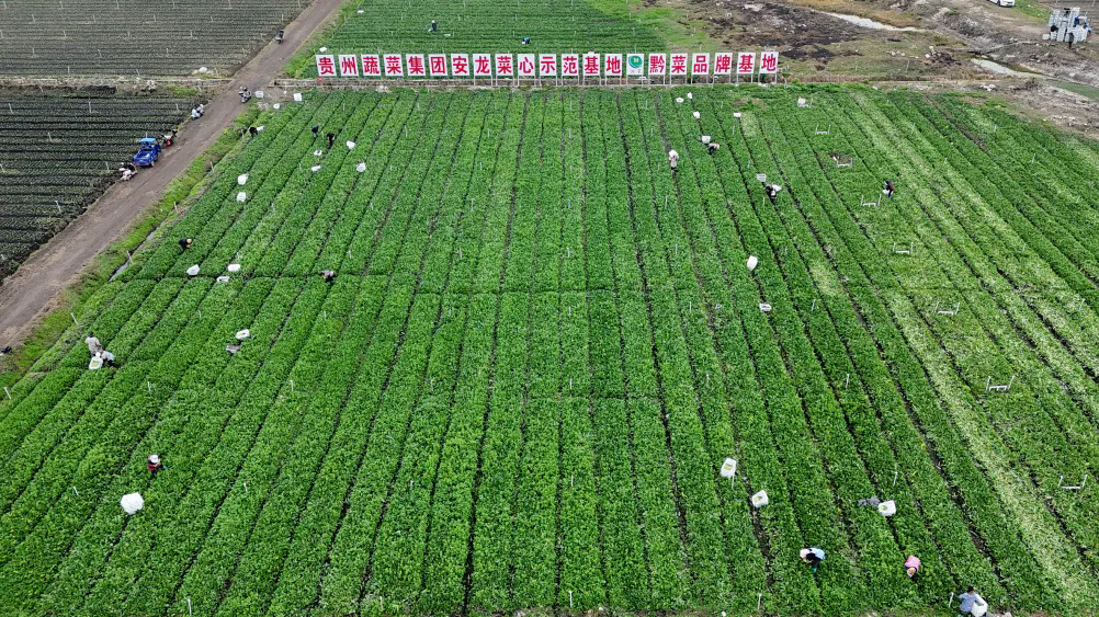 眼下,黔西南州安龙县春潭街道阳方社区1400亩蔬菜陆续成熟,基地正组织村民抓紧采收,抢鲜供应冬季蔬菜市场,田间地头一派喜人的丰收景象。