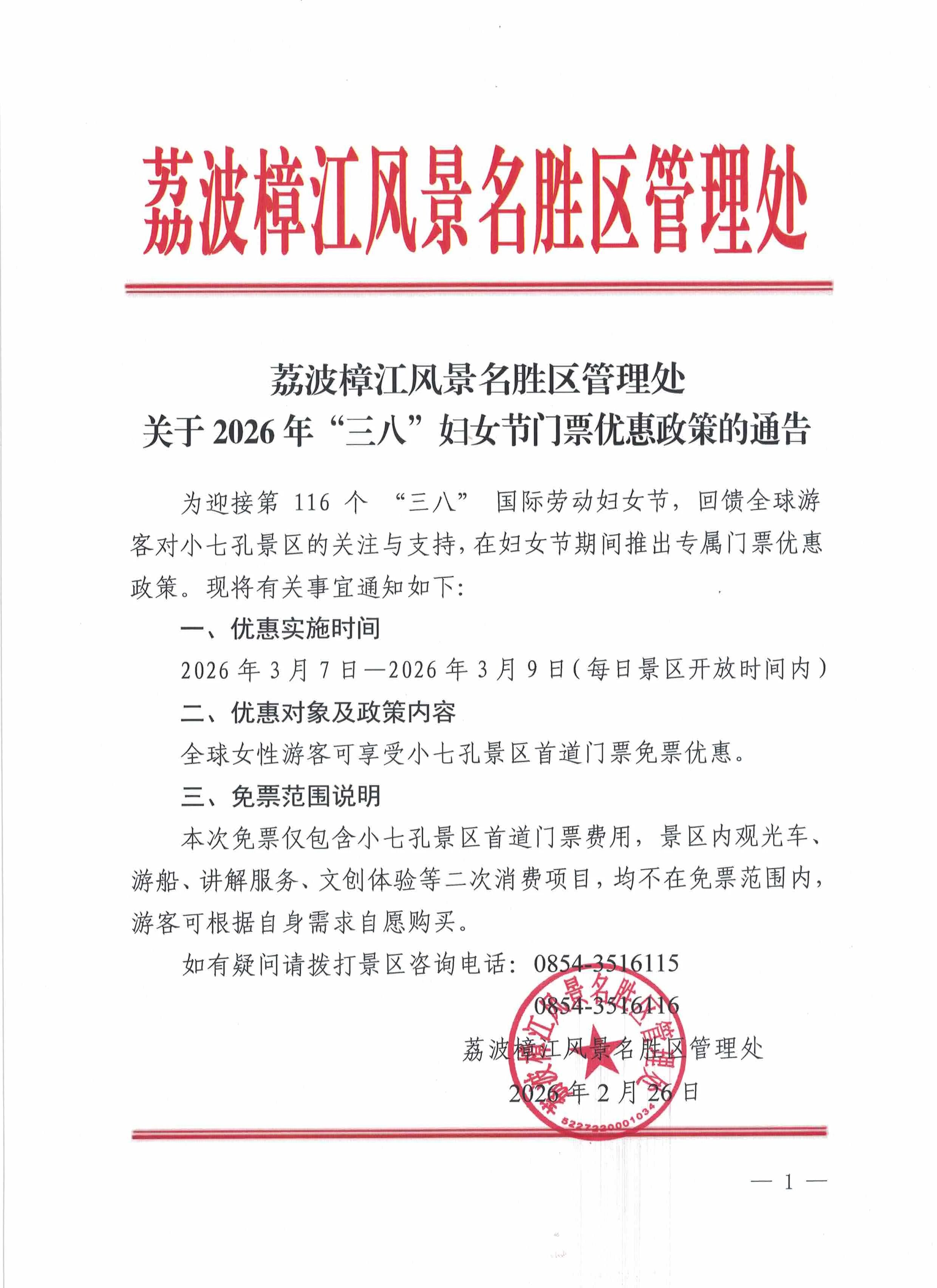 为迎接第 116 个 “三八” 国际劳动妇女节,回馈全球游客对小七孔景区的关注与支持,在妇女节期间推出专属门票优惠政策。现将有关事宜通知如下: