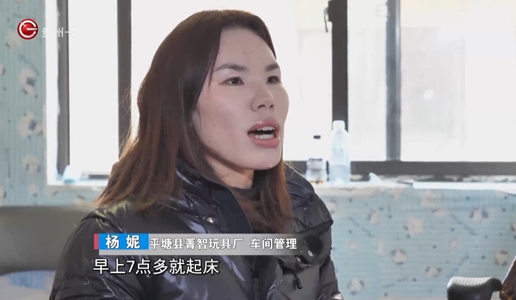 平塘县菁智玩具厂车间管理杨妮:我一般是早上7点多起床送小朋友去学校,八点到厂里面上班,中午还有午休时间,下午五点去接小朋友放学。