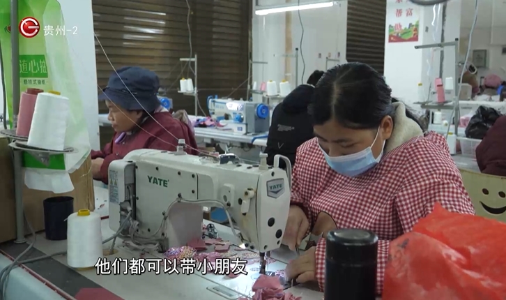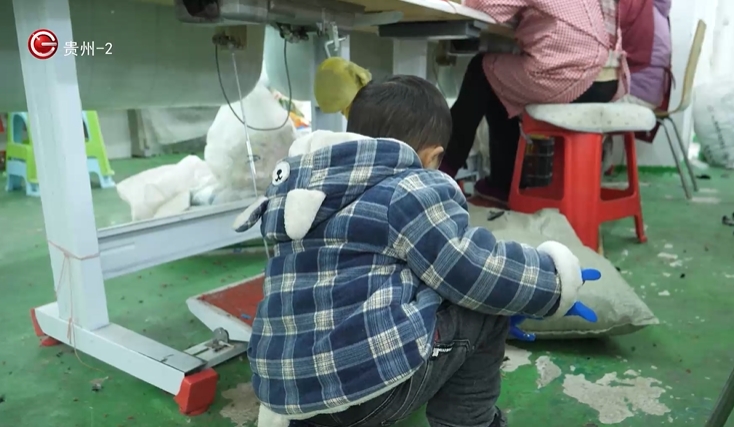 平塘县菁智玩具厂总经理冉如均:我们同意她们带小孩来上班,因为这个车间里面生产的产品没什么危险性,带着孩子也是解决她们的后顾之忧,厂里面还为孩子们提供免费午餐。