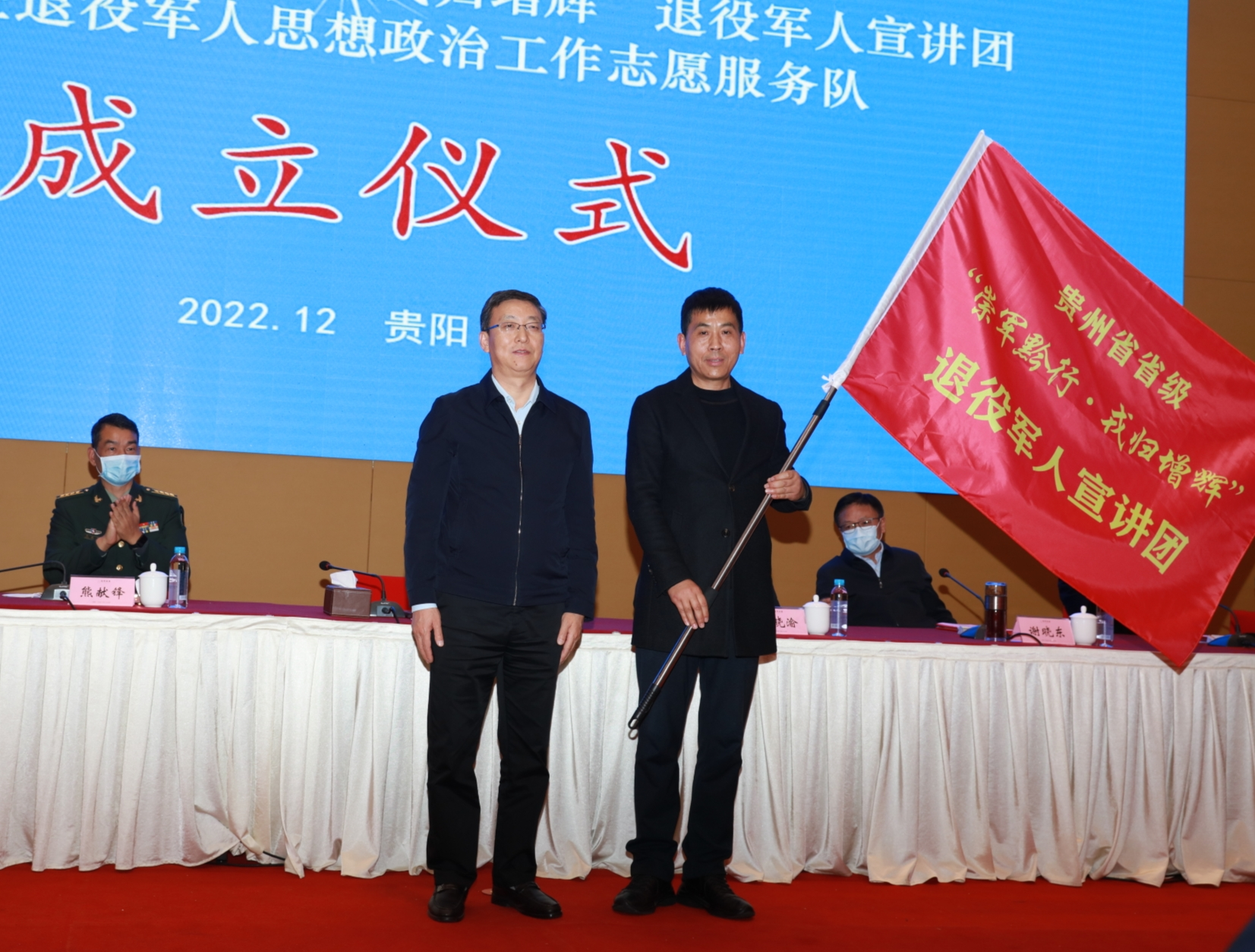 12月6日,贵州省省级“崇军黔行·戎归增辉”退役军人宣讲团暨退役军人思想政治工作志愿服务队成立仪式在贵阳息烽举行。省退役军人事务厅党组书记、厅长孙拥辉出席并讲话,省退役军人事务厅党组成员、副厅长刘晓渝,省军区转业办大校主任熊献锋,省退役军人事务厅一级巡视员谢晓东,贵阳市警备区大校副司令员郑风潮出席,息烽县委副书记、县人民政府县长何明致辞。