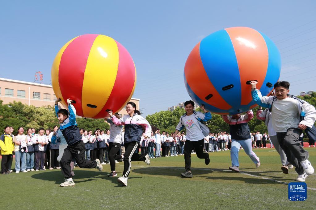 5月31日,在淮北市第十二中学,高三学生在参加“运转乾坤”趣味减压游戏。高考临近,安徽省淮北市第十二中学组织高三年级学生开展丰富多彩的集体减压活动,让学生们在趣味游戏中释放压力,以轻松、乐观、自信的心态迎接高考。新华社发(万善朝 摄)