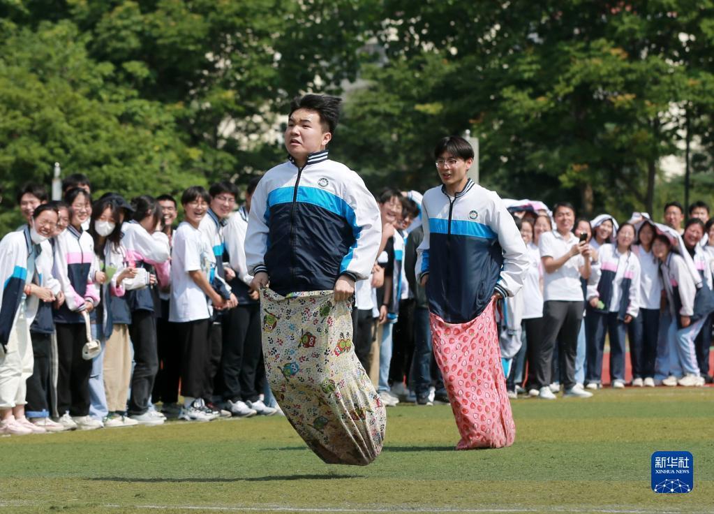 5月31日,在淮北市第十二中学,高三学生在参加“袋鼠跳”趣味减压游戏。新华社发(万善朝 摄)