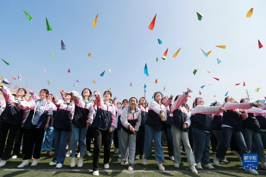 5月31日,在淮北市第十二中学,高三学生在操场上扔纸飞机。新华社发(万善朝 摄)