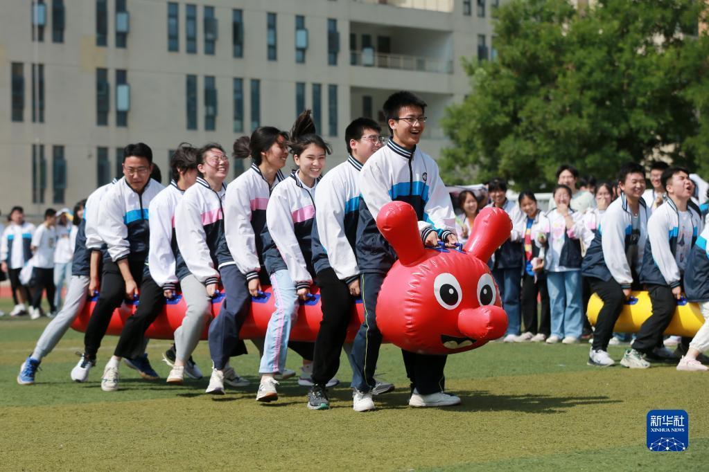 5月31日,在淮北市第十二中学,高三学生参加“毛毛虫”赛跑趣味减压游戏。新华社发(万善朝 摄)