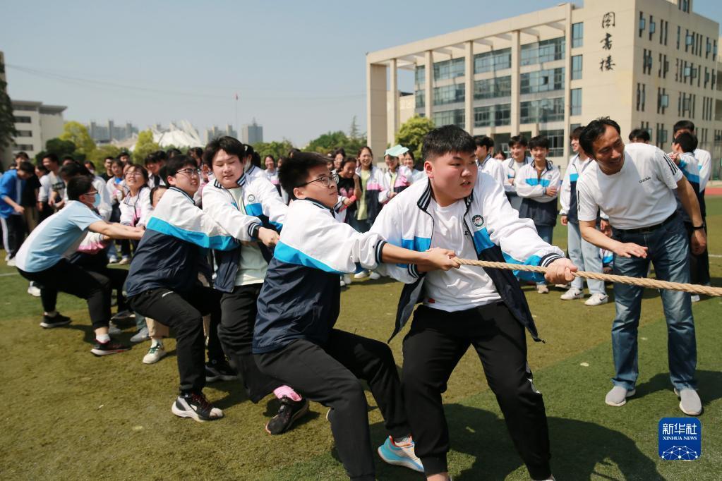 5月31日,在淮北市第十二中学,高三学生参加拔河比赛。新华社发(万善朝 摄)