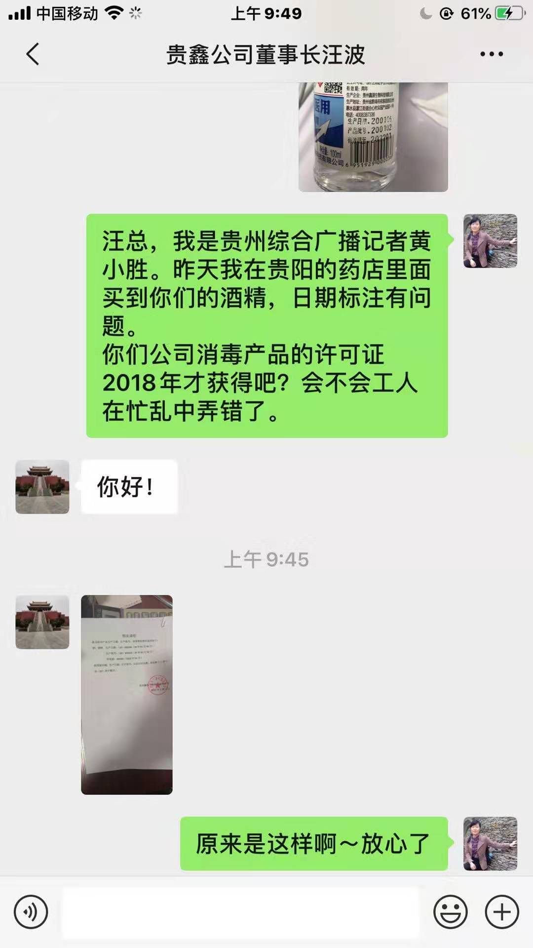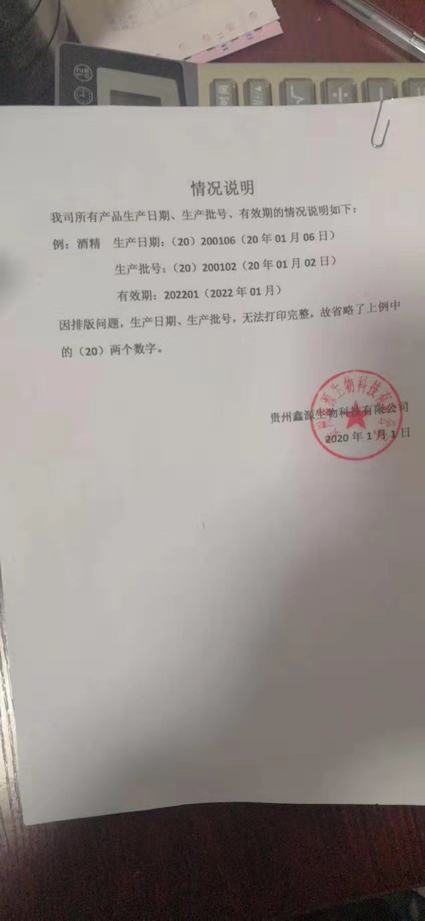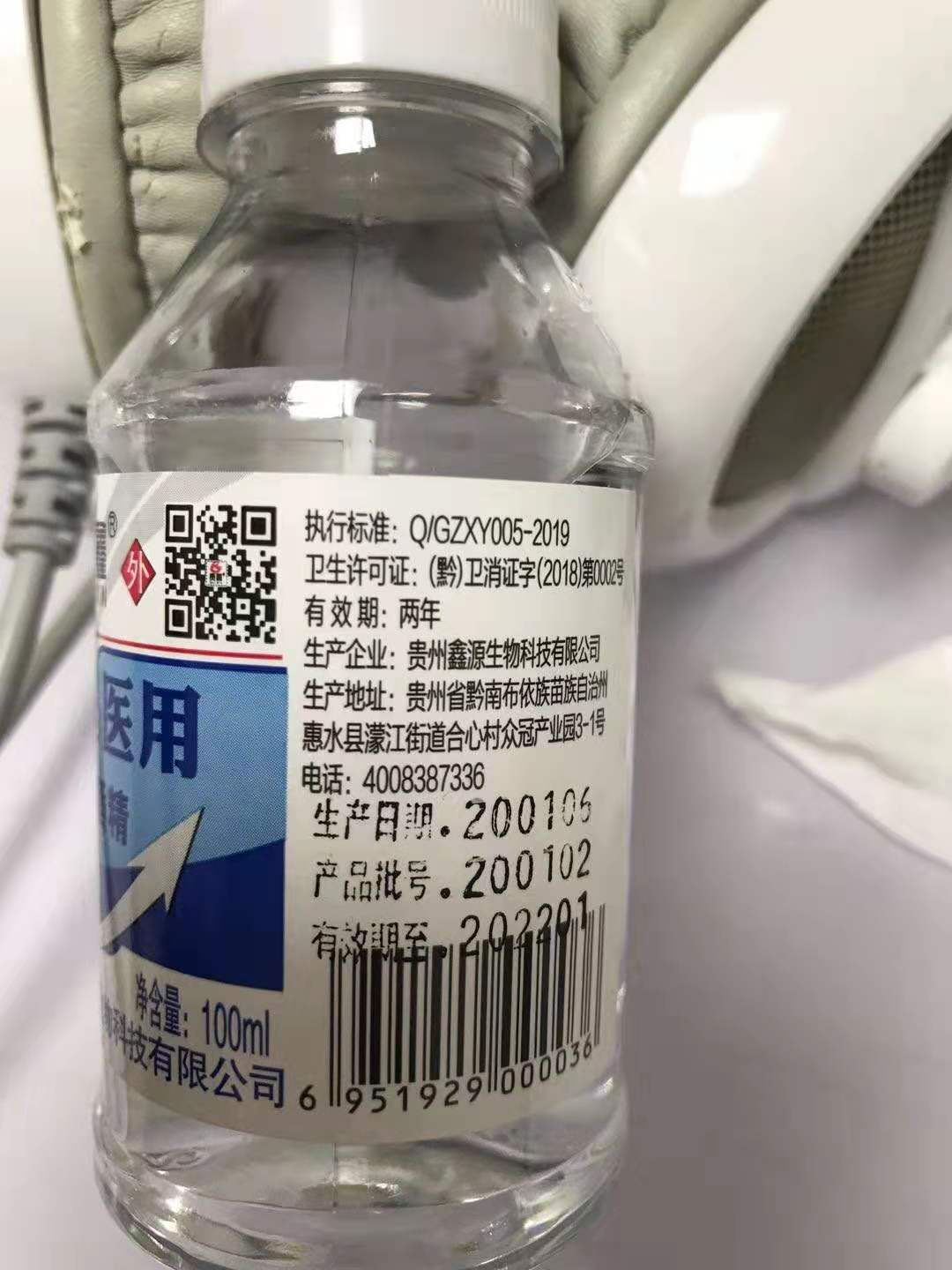 1月31日,记者在位于贵阳市都司路的一家药店购买医用酒精,每人限购两瓶,100毫升/瓶,每瓶1.5元。当天晚上,记者准备使用酒精时发现生产日期有问题。于是记者查阅了贵州鑫源生物科技有限公司官网。官网显示公司成立于2017年。带着疑惑,记者于2月1日联系上贵州鑫源生物科技有限公司董事长汪波,董事长给出了答复:“因排版问题,生产日期、生产批号,无法打印完整,故省略了(20)两个数字。”