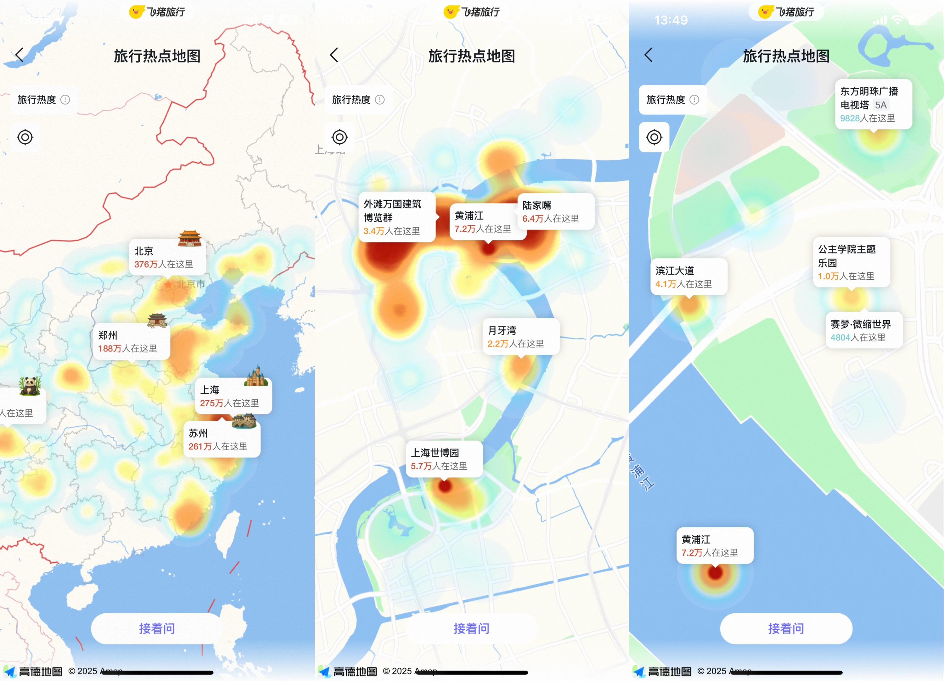 实测发现,在飞猪“问一问”首页点击“为我发现目的地”,即可查看全国各大目的地的旅行热度。用户可以手动对任一感兴趣的区域放大查看,信息能精准到公园、博物馆、标志性建筑物等景点。